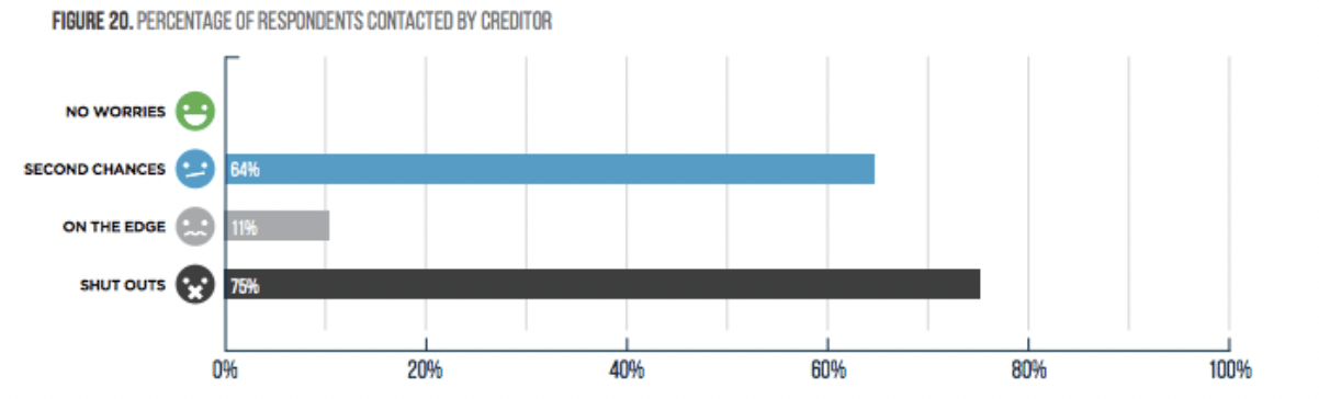 The greatest measure for the definition of each group may be how often each reported being contacted by creditors. Literally, not one person who fits into the No Worries group reported ever being contacted by a creditor; paying bills in on time is the hallmark of this group.
